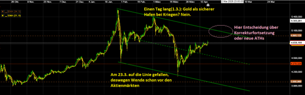 Entsprechend prallte der Preis für Brent-Rohöl im März zwei Mal an der 120 USD-Marke ab, wurde wochenlang an der 100er-Marke festgezurrt und droht nun eher wieder einmal nach unten zu marschieren in Richtung 50 USD als in die Richtung des Hochs von 140 zu Beginn des Ukrainekriegs 2022. Originellerweise entsprach der Hochpunkt Anfang März der oberen Linie des Korrekturkanals, wenn man einen solchen aus der Verbindung des Ukrainehochs und den beiden unteren Punkten danach verbindet. Der Ölpreis ist ein ebenso janusköpfiges Wesen. Sowohl sein Fallen als auch sein Steigen können gleichermaßen für oder gegen Krisenverschärfung sprechen. Nicht zu vergessen ist, dass man mit hohen Preisen Russland verwöhnen würde, was man doch – so Baerbock 2022 – in die Knie zwingen will. Ein Preisverfall würde zwar Importländer wie Deutschland frohlocken lassen, könnte aber kann auch vor dem Hintergrund einer wirtschaftlichen Depression geschehen.