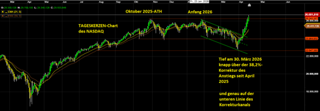 Die wahnwitzig hohen Bewertungen an der High-Tech-Leitbörse NASDAQ ließen Anfang des Jahres ein Platzen der Blase für unausweichlich scheinen. Vor allem die Charts der „Magnificent Seven“ sahen aus wie der Schiefe Turm von Pisa. Am 10. Februar prallte der NASDAQ knapp unter seinem Allzeithoch vom Oktober 2025 nach unten ab, um dann im März – zusammen mit den anderen Leitindizes – den Irankrieg als Anlass für einen Abverkauf zu nehmen. So weit, so schön für die Bären, die ja im Aufgeklärtenlager die Mehrheit bilden. „Ein bisschen Frieden, ein bisschen Liebe“ – nicht einmal das, sondern die Aussicht darauf ließ den NASDAQ am 30. März nach lächerlichen 13 Prozent Korrektur wieder drehen und am 17. April auf ein neues Allzeithoch schießen.