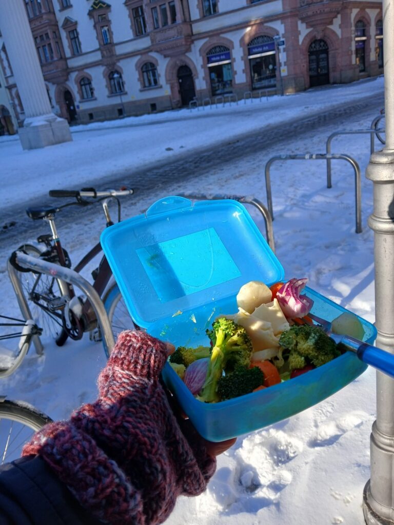 - schnipseln wir jungen Kohl (sehr bekömmlich ist Spitzkohl) und/oder Brokkoli, Kohlrabi, in Wurzelform Petersilie, Sellerie oder Pastinaken (zwar 18g Kohlenhydrate, aber bei der Low-Carb-Rechnung kann man die Menge an Ballaststoffen von der Zuckerbilanz abziehen!) / Petersilie, eine rote Zwiebel. Meistens wird das Ganze dann mit kochendem Wasser überschüttet und eine Minute auf diese Weise aromatischer und bekömmlicher gemacht.