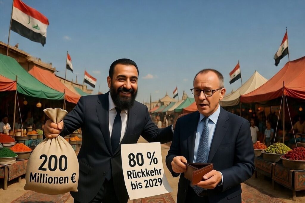Dass es aus Deutschland immer Geld gibt, das weiß die ganze Welt. Die Knöpfe, die es bei uns zu drücken gilt: seit Jahrzehnten Teil des internationalen politischen Handwerks. Während die „80 %“ schon wieder bis zur Unkenntlichkeit relativiert und dementiert sind, bleibt die Zusage von Friedrich Merz über 200 Millionen Euro für den Wiederaufbau Syriens eine offizielle Vereinbarung des Staatsbesuchs. Merz knüpfte diese finanzielle Hilfe jedoch explizit an die Bedingung, dass die syrische Übergangsregierung die Voraussetzungen für eine großflächige Rückkehr der Geflüchteten schafft. Um die Einhaltung und Umsetzung dieser Ziele zu überwachen, werde eine gemeinsame Arbeitsgruppe (Taskforce) eingerichtet. Da aber schon die Zielmarke „80 %“ weich wie Butter ist, ist es eine hohle Ankündigung, die aber schöne neue Stellen im öffentlichen Dienst schafft.