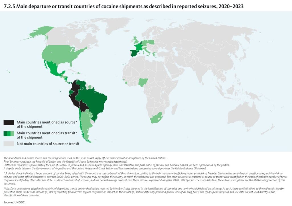Wenn es wirklich gegen die Drogen ginge, dann wäre doch Kolumbien das Angriffsziel der ersten Wahl gewesen. Oder Mexiko, das als Vorhof zu den USA alles bereithält, was dem nördlichen Nachbarn Sorgen bereitet: illegale Migranten, Drogen-, Waffen- und Menschenhandel. Die Drogenquellen sind eher in den Andenstaaten zu finden, wie eine Darstellung im UNODC-Weltdrogenbericht 2025 zeigt – oder Spanien, Niederlande und Belgien als Drogen-Hubs:
